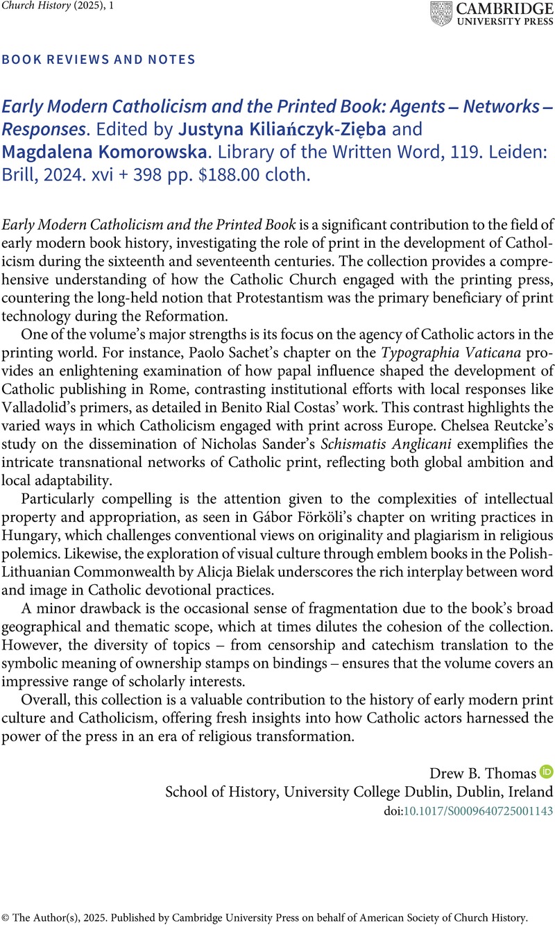 Justyna Kiliańczyk-Zięba and Magdalena Komorowska (eds.), Early Modern Catholicism and the Printed Book: Agents – Networks – Responses (Brill, 2024) in Church History, 94:1 (2025).